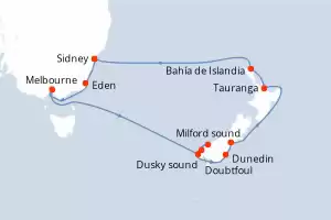 Itinerario : Sidney, Eden, Melbourne, Dusky sound, Milford sound, Doubtfoul, Dunedin, Timaru, Tauranga, Bahía de Islandia, Sidney