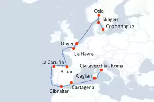 Itinerario : Civitavecchia - Roma, Cagliari, Cartagena, Gibraltar, La Coruña, Bilbao, Le Havre, Dover, Oslo, Skagen, Copenhague