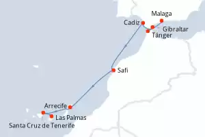 Itinerario : Malaga, Tánger, Gibraltar, Cadiz, Safi, Arrecife, Santa Cruz de Tenerife, Las Palmas
