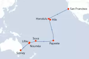 Itinerario : San Francisco, Honolulu, Hilo, Papeete, Suva, Lifou, Nouméa, Sidney